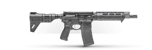 The SAINT® Pistol 5.56 offers the legendary performance of the SAINT in a compact package. The pinned Picatinny gas block is both unobtrusive and utterly reliable. The 9.6″ chrome moly vanadium barrel combines accuracy with maneuverability. The gun’s nickel boron-coated fire controls, rugged Carpenter 158 steel bolt, and slick Trinity Force® Breach Brace make for a pistol that delivers.
